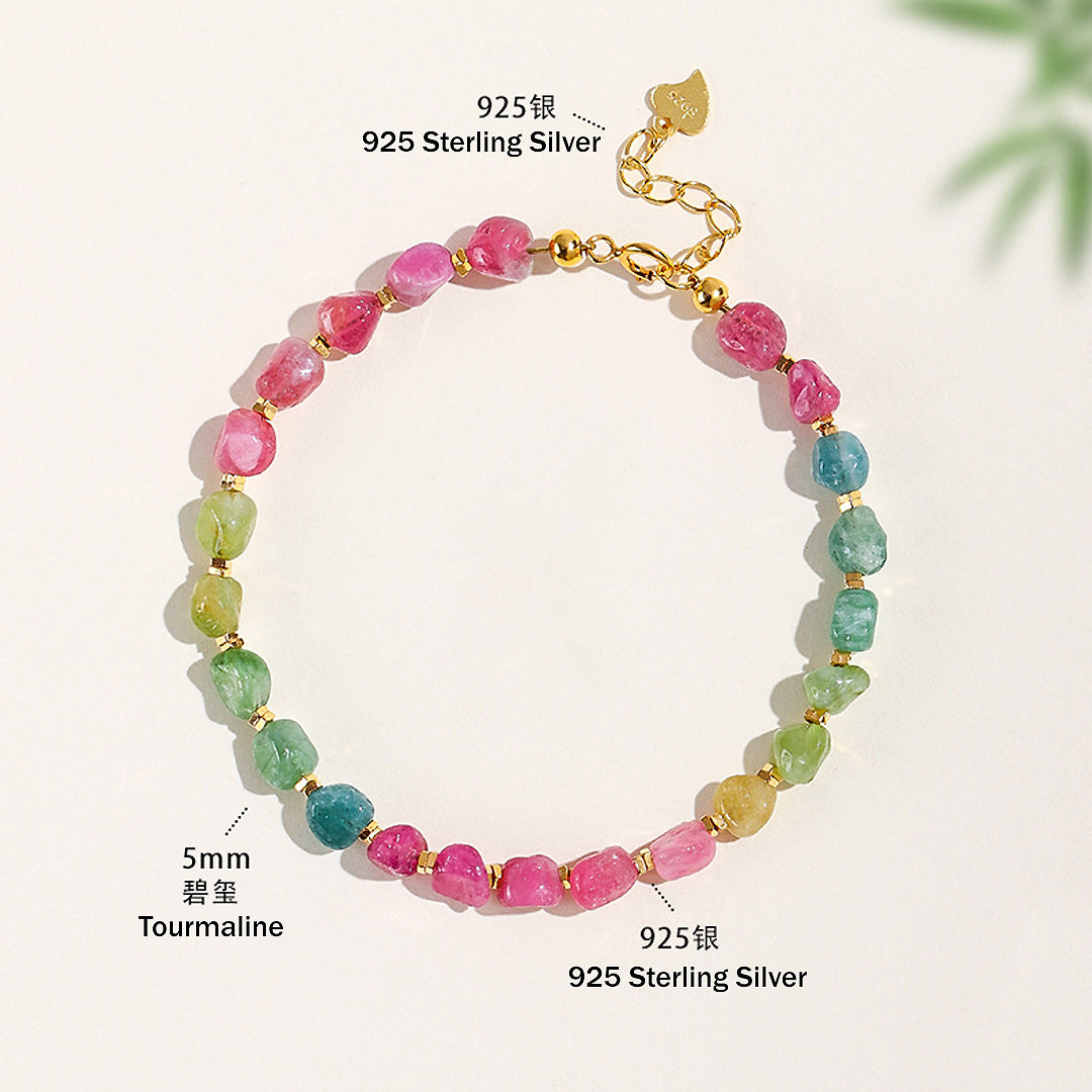 The C255 – Multicolour Tourmaline Bracelet is a celebration of colour, energy, and refined craftsmanship. Each organically shaped tourmaline bead reveals its natural texture and unique hue, creating a vibrant yet elegant gradient that wraps gracefully around the wrist. Accented with polished 925 sterling silver and warm gold-toned details, the bracelet radiates understated luxury while remaining effortlessly wearable.