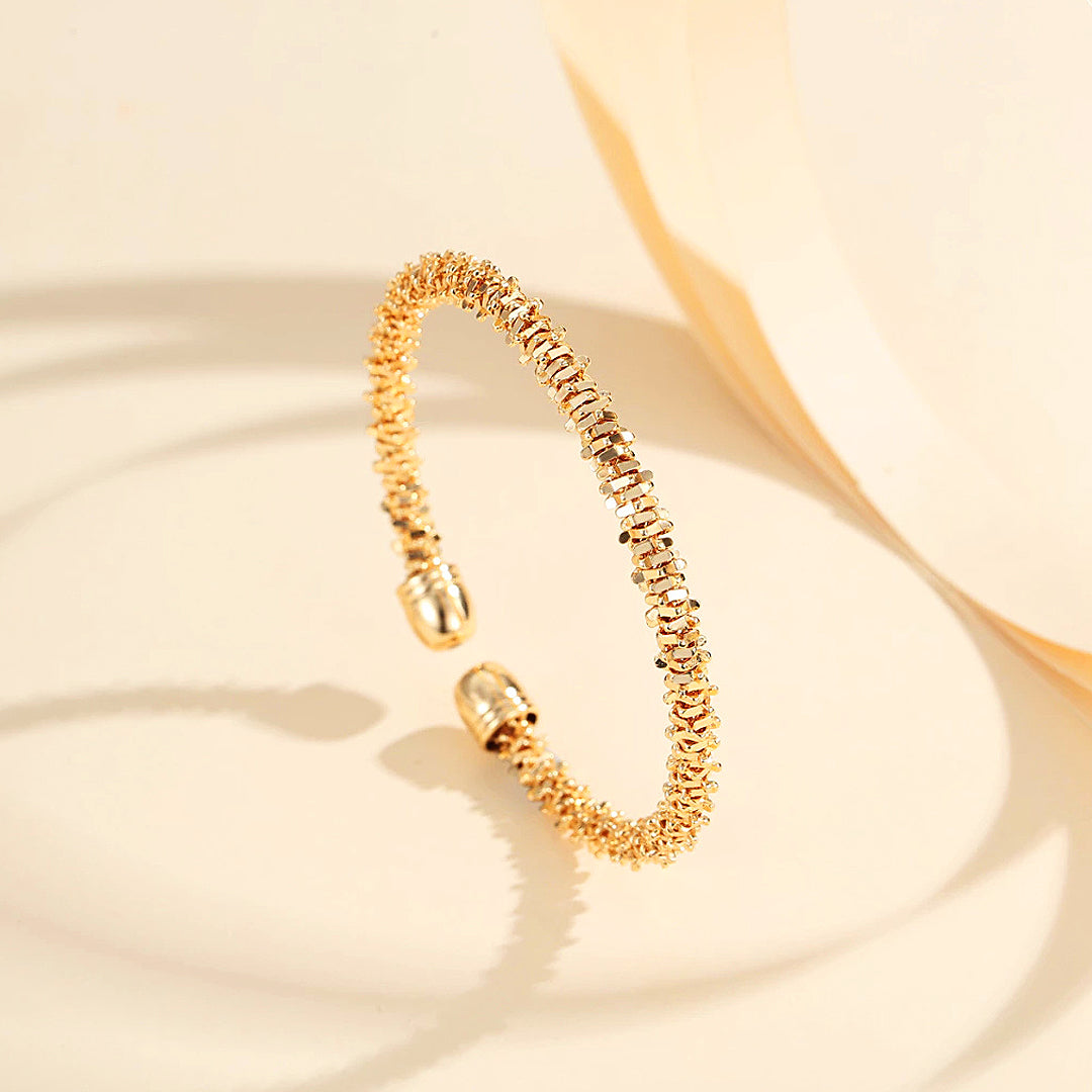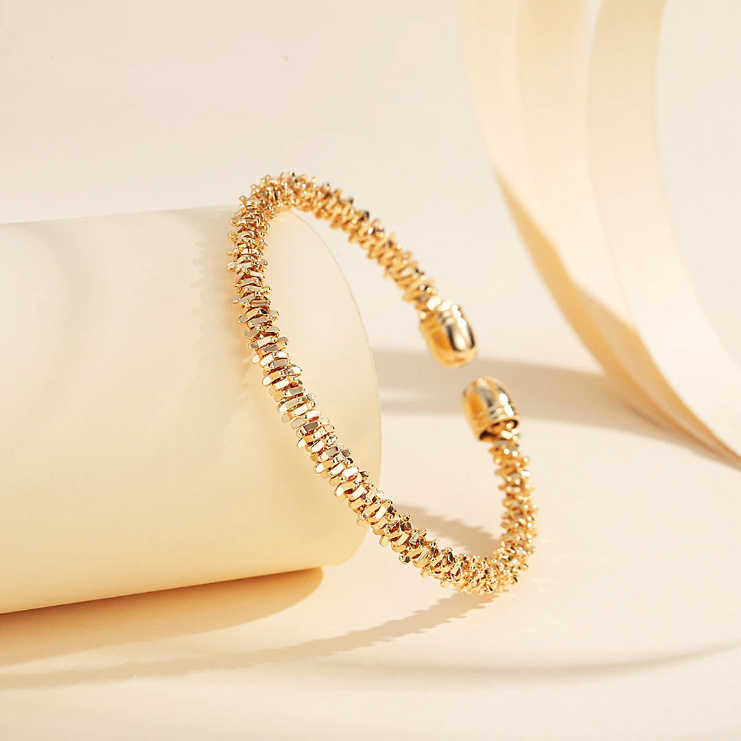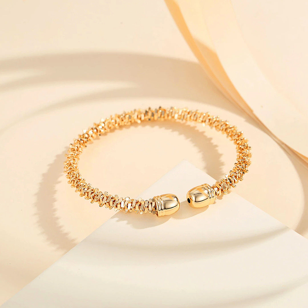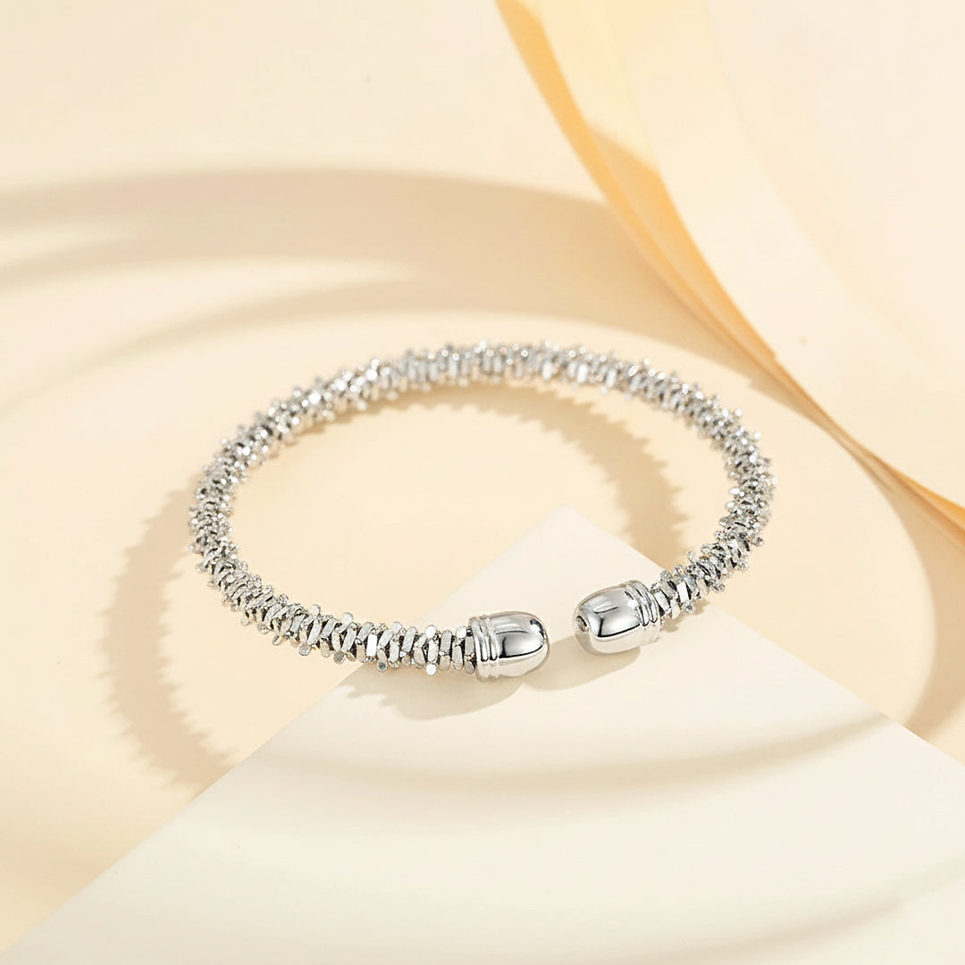 The Luxe6500 Cuff is where refined elegance meets sculptural artistry. Crafted with a distinctive textured silhouette, each tiny reflective element catches the light with mesmerizing brilliance, creating a sparkling halo effect around the wrist. The open-cuff design is finished with smooth rounded caps, giving the piece a polished and luxurious profile while ensuring effortless wear. Available in both radiant gold and luminous white gold plating, this cuff instantly elevates any outfit—whether worn alone as a statement piece or stacked for a modern, layered look.
