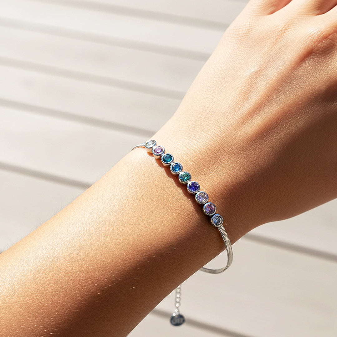 The vivid gradient of gemstones adds a joyful touch of personality to your wrist — refined enough for daily sophistication, yet striking enough to elevate any look. Lightweight, comfortable, and effortlessly radiant, this bracelet is the perfect statement of confidence and colour. A must-have piece for those who love timeless quality with a modern twist.