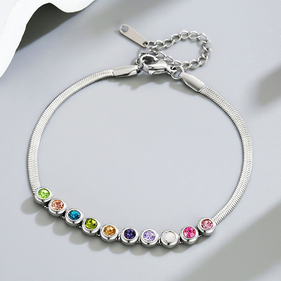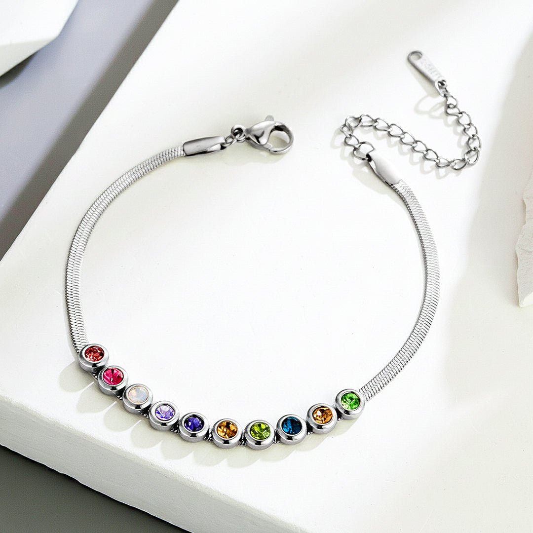 Bright, modern, and irresistibly vibrant, the Luxe6504 Bracelet brings colour to elegance with its stunning row of bezel-set stones, each shimmering in a unique shade of the rainbow. Crafted from ultra-durable titanium steel and perfected with five layers of electroplating, it offers a sleek, polished finish designed to endure everyday wear without fading or irritation.