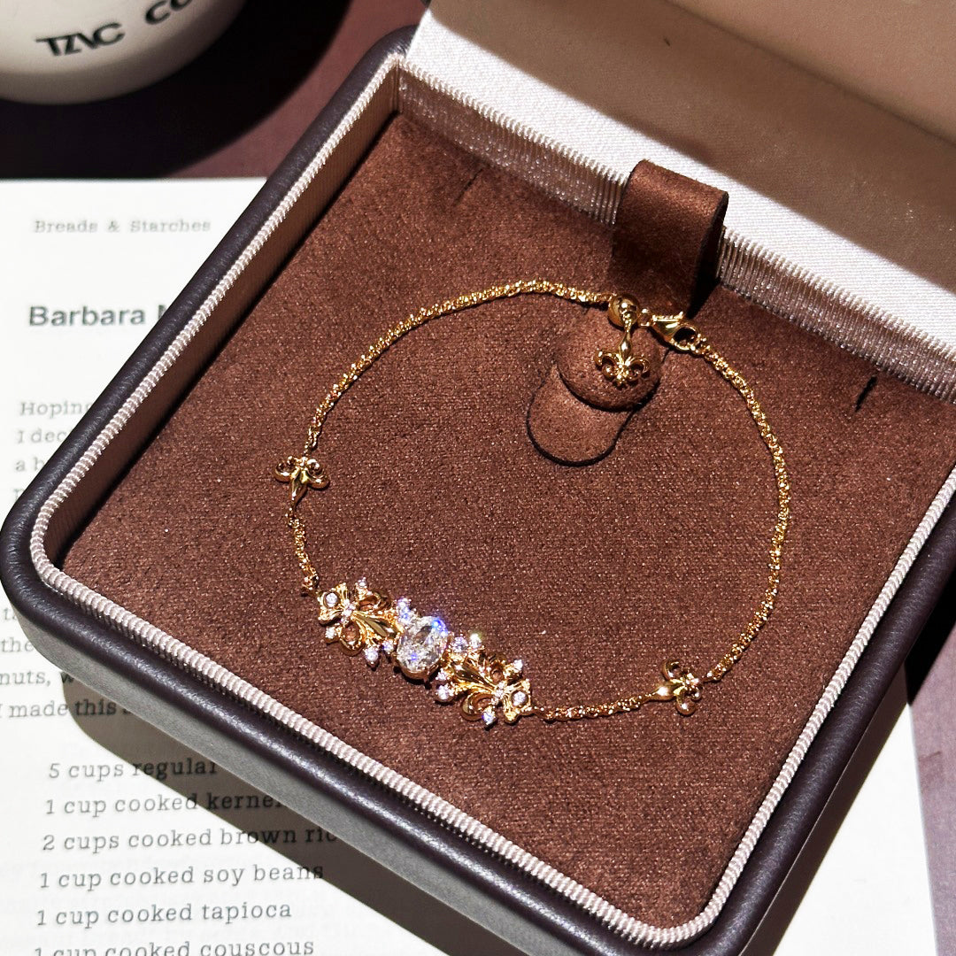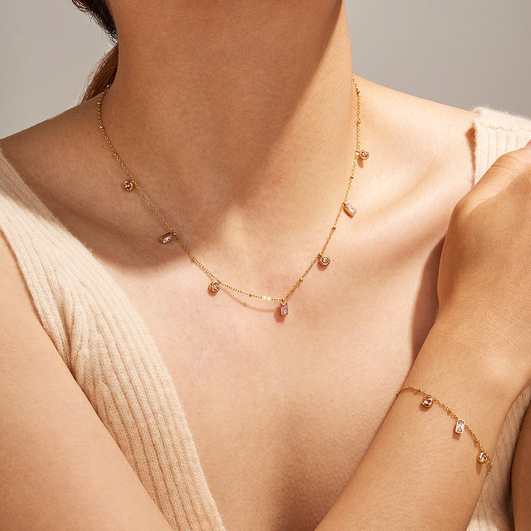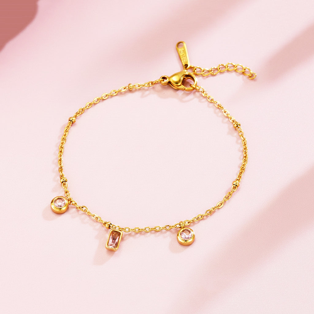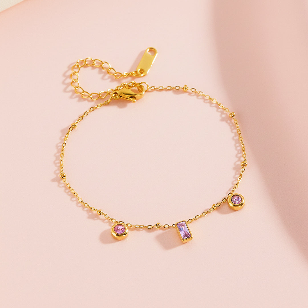 Delicate, feminine, and effortlessly elegant — the Luxe6505 Bracelet is designed for those who adore subtle luxury. This dainty chain features a trio of soft pink charms, including a baguette-cut centerpiece and two round bezel-set stones that shimmer with every movement. The fine gold-plated chain is thoughtfully crafted to feel weightless on the wrist, making it perfect for daily wear or for elevating any special occasion look. Refined yet playful, this bracelet adds the perfect touch of colour and sophistication to your jewellery collection — a piece you’ll reach for again and again.