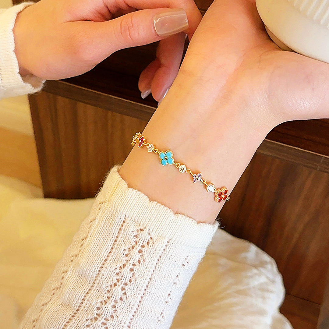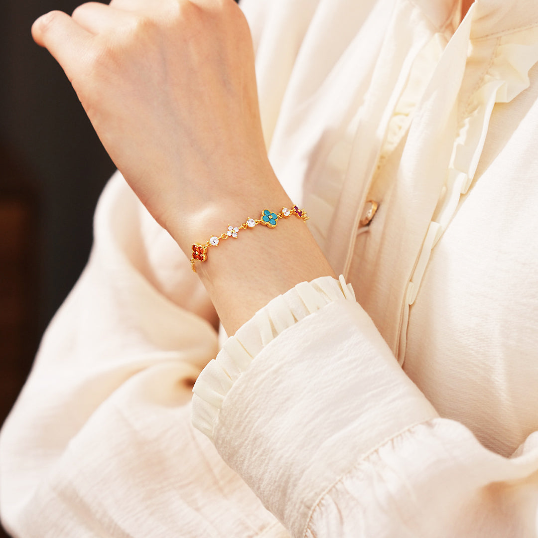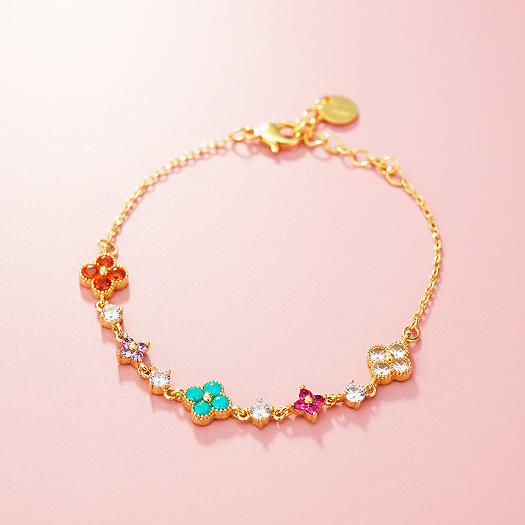 Every flower is framed with meticulous gold beading, adding depth and charm while maintaining a high-end, polished finish. The slim chain drapes beautifully on the wrist, offering lightweight comfort and an effortlessly feminine silhouette. Hypoallergenic, tarnish-resistant, and crafted for daily wear, Luxe6513 brings a joyful touch of luxury to your jewellery collection — perfect on its own or layered for a statement look.