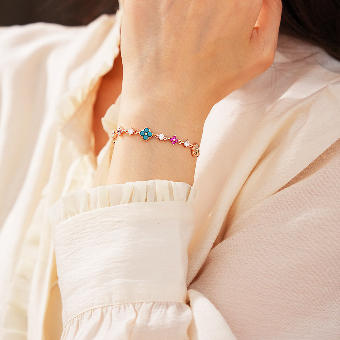 A celebration of colour, elegance, and refined craftsmanship — the Luxe6513 Bracelet is designed to brighten every moment. This dainty piece features a curated row of miniature floral motifs, each delicately adorned with vibrant stones in turquoise, ruby pink, lilac, crystal white, and warm amber tones. The playful yet sophisticated palette creates a captivating gradient of blooms that instantly catches the light and elevates any outfit.