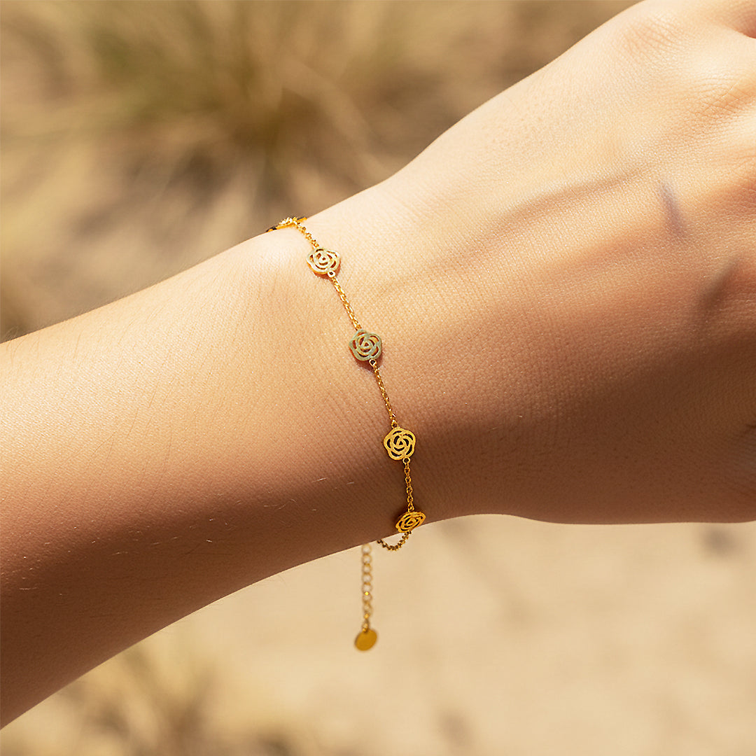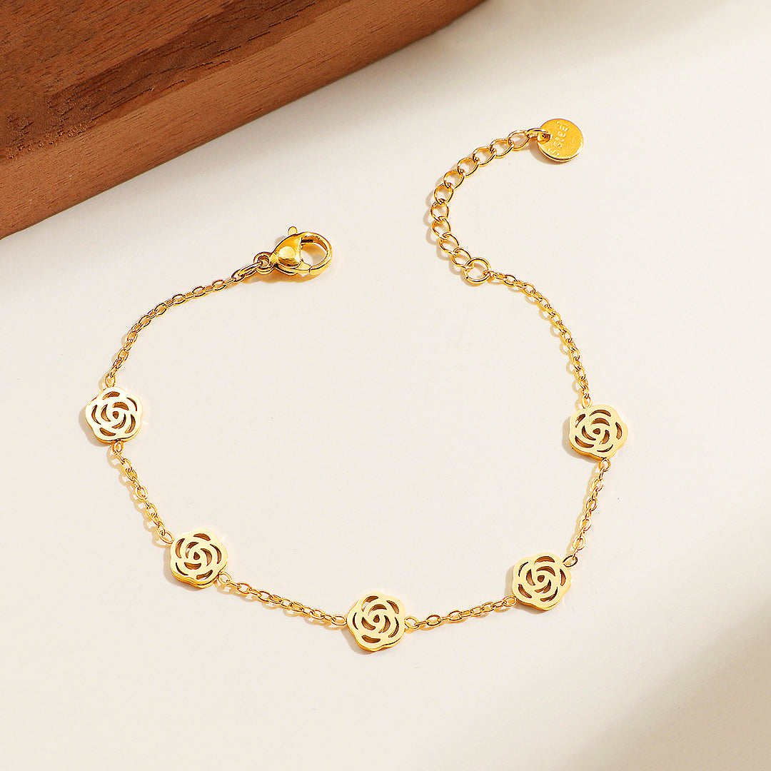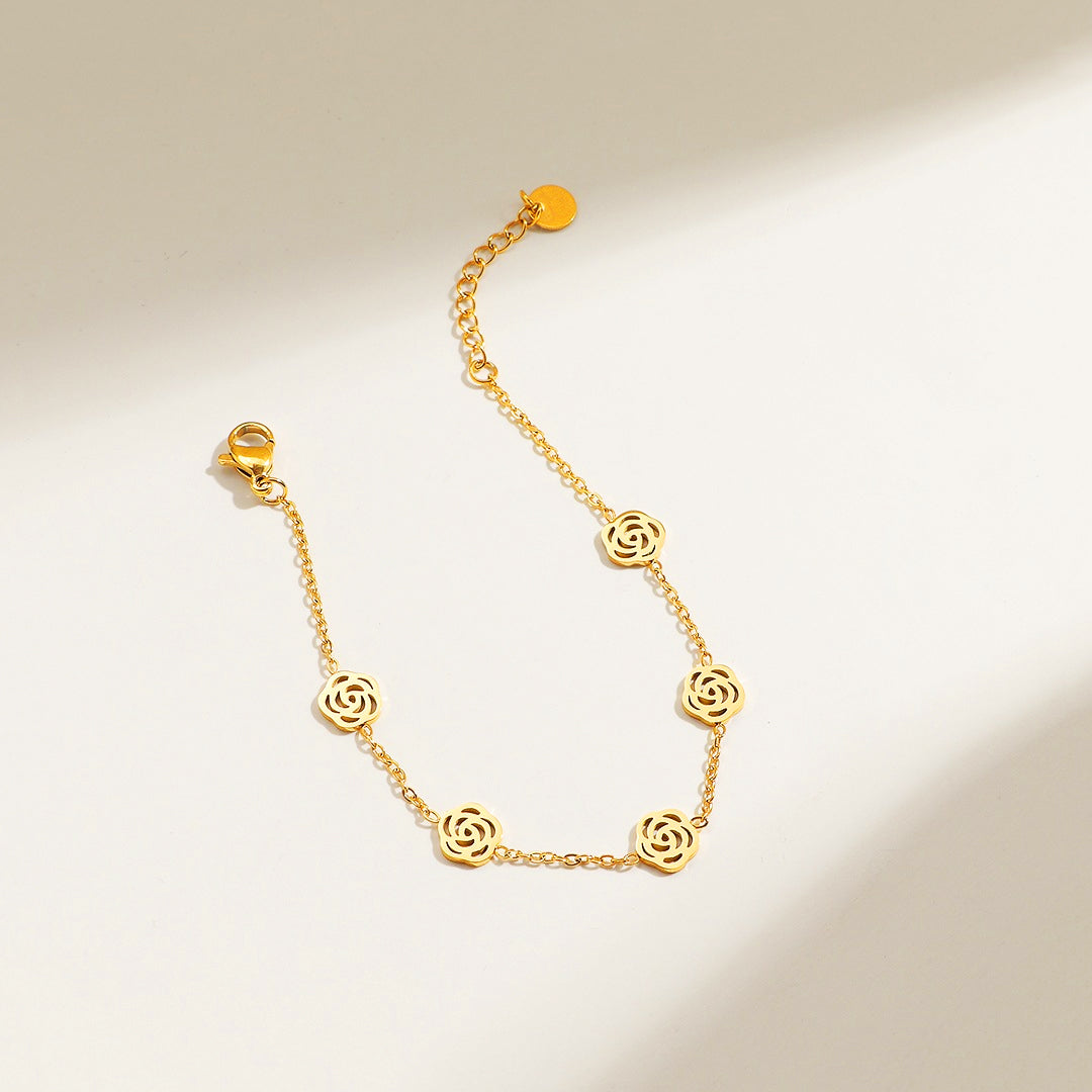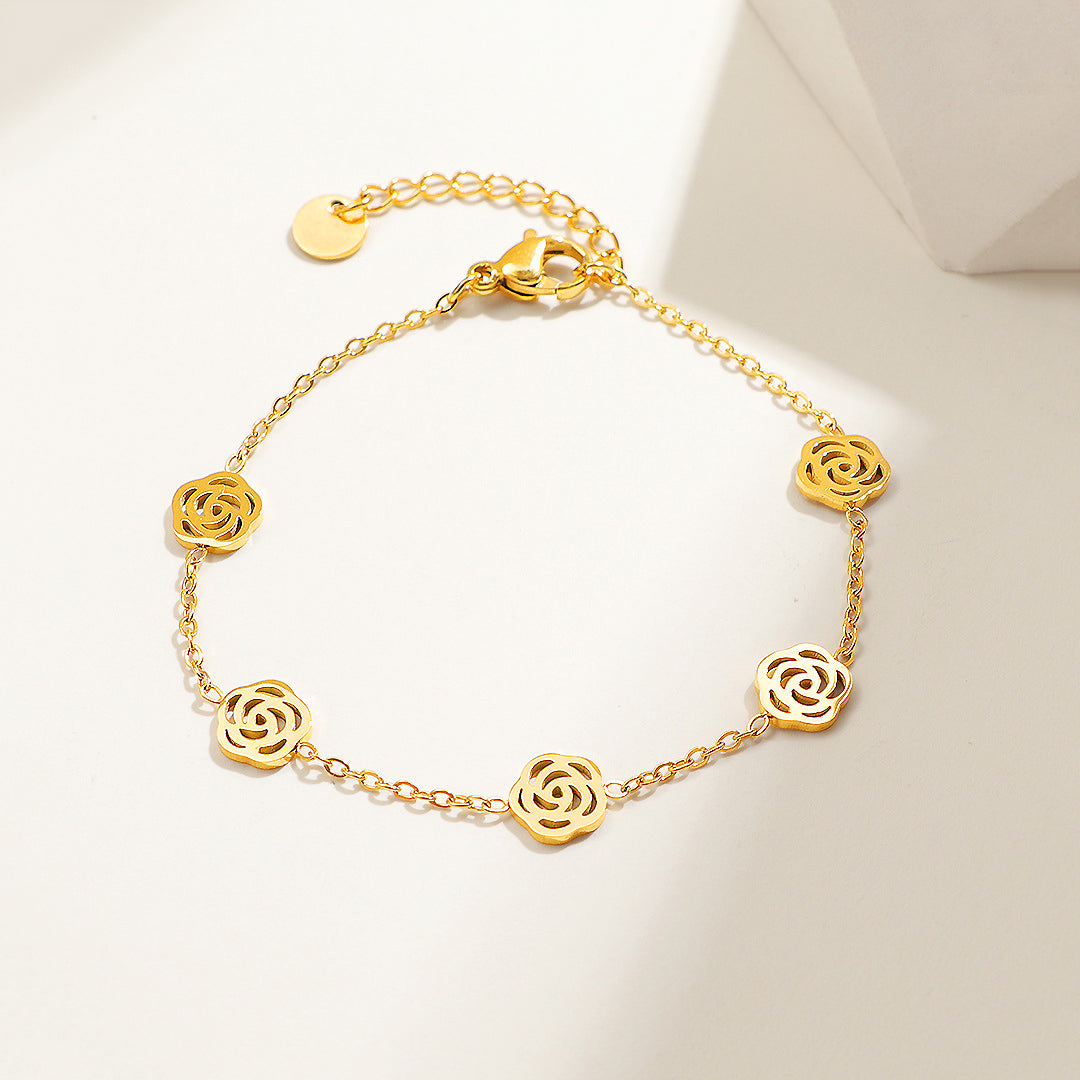 The Luxe6516 Bracelet is designed for those who adore understated elegance with a touch of timeless romance. Featuring a delicate sequence of intricately cut rose-inspired motifs, each link reflects a soft feminine charm while maintaining a clean, modern silhouette. Crafted from premium titanium steel and finished with five layers of rich electroplating, this bracelet offers lasting shine, remarkable resilience, and daily wearability without fading or irritation. Sparkling AAAAA zircon accents add a subtle brilliance that catches the light with every graceful movement.
