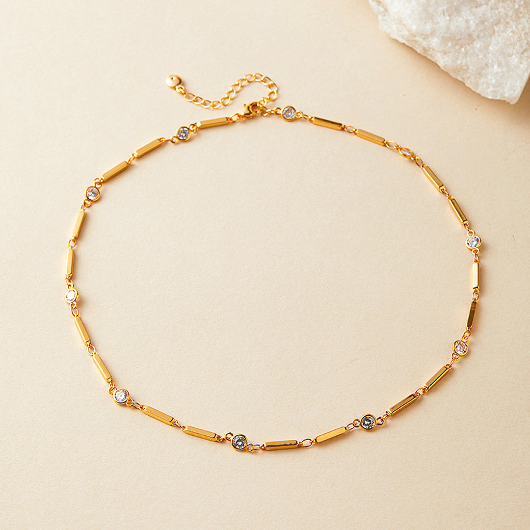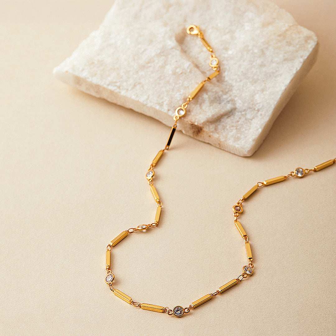 Adorn your neckline with the chic, contemporary radiance of the Luxe4421 Golden Glimmer Link Necklace. This piece features a captivating modern design composed of polished gold-plated bar links, alternating seamlessly with delicate, round-set AAAAA Cubic Zirconia stones. The geometric gold bars catch the light with a sleek, mirror-like reflection, while the highly brilliant zircon accents provide bursts of stunning, diamond-like sparkle.