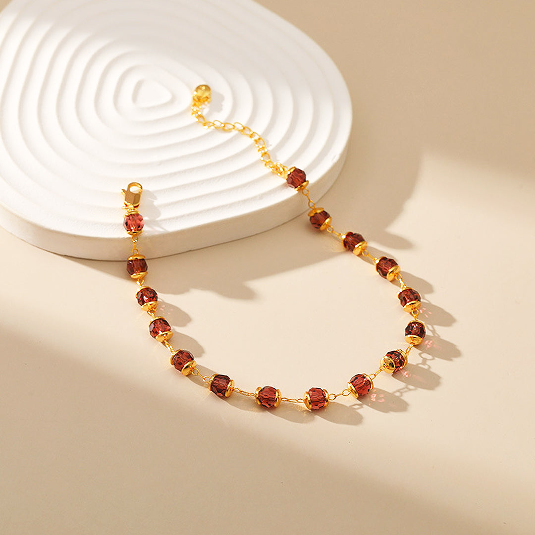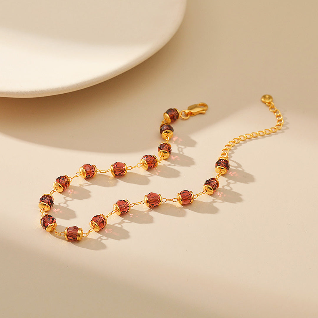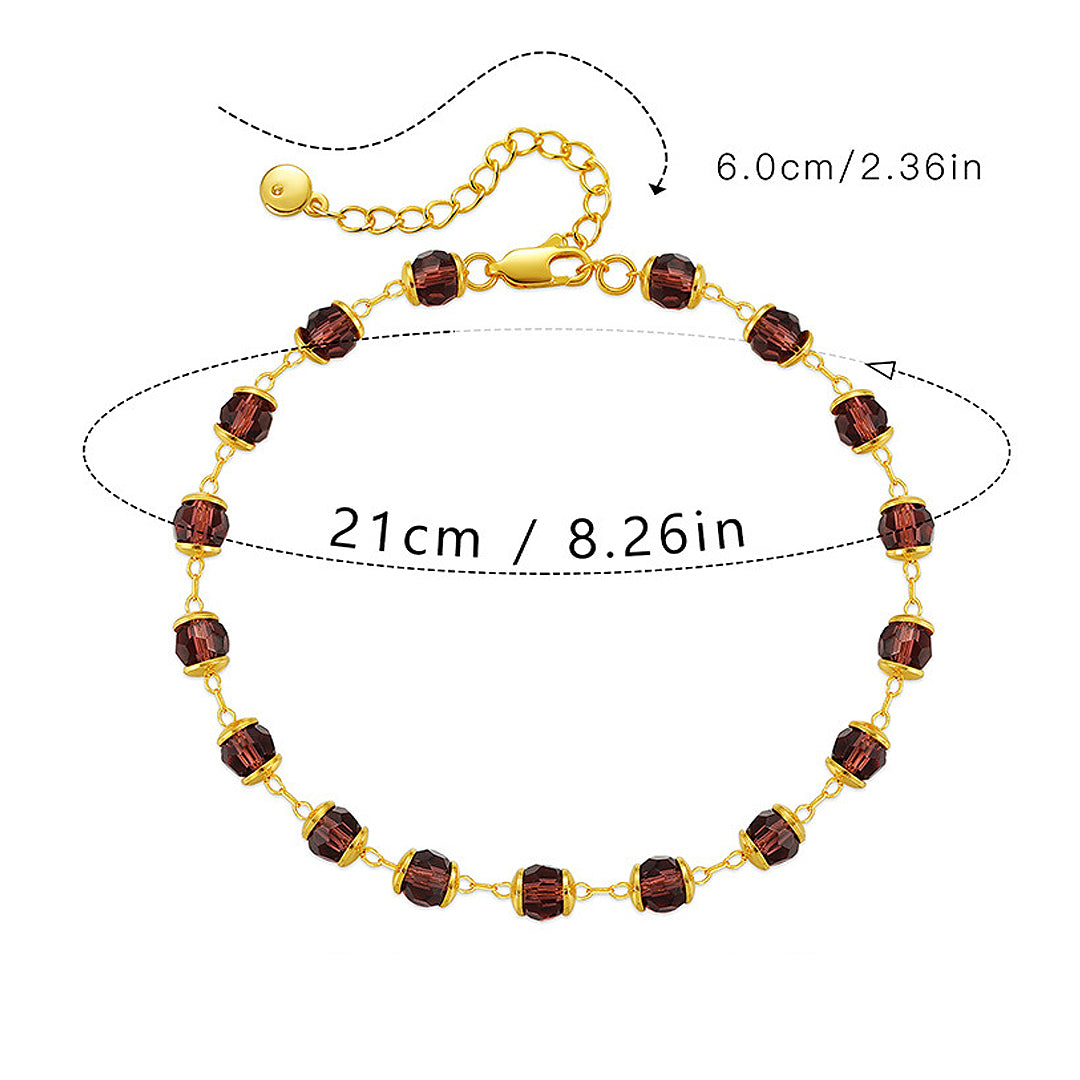 Adorn your ankle with the warm, passionate glow of the Luxe9282 Anklet. This exquisite piece features a continuous line of deep red, faceted glass beads, each perfectly spaced by smooth, highly polished gold links. The rich, garnet-like color of the beads provides a striking, opulent contrast against the radiant Gold Plating, which is meticulously applied using a robust five-layer electroplating process.