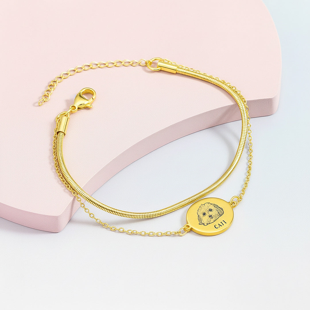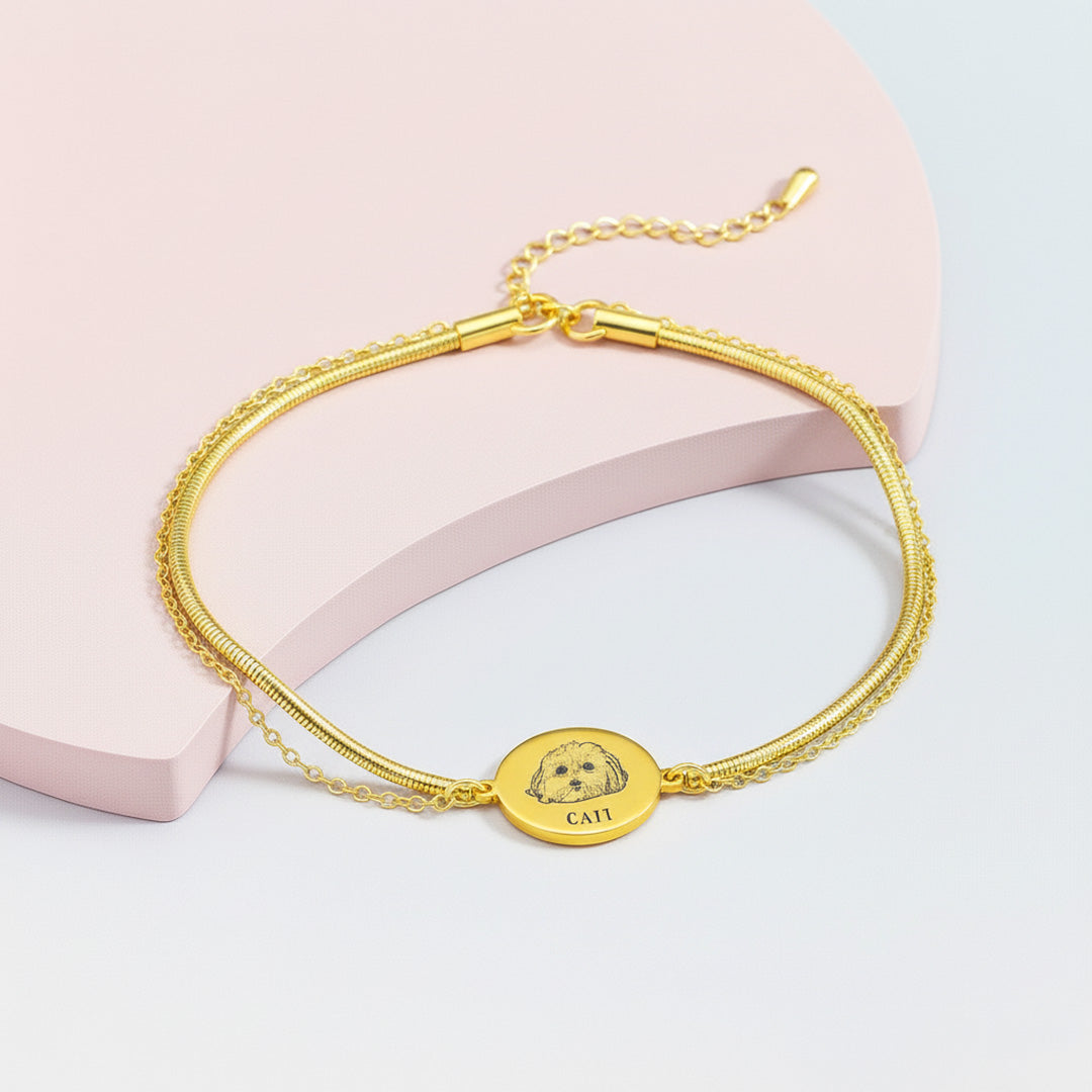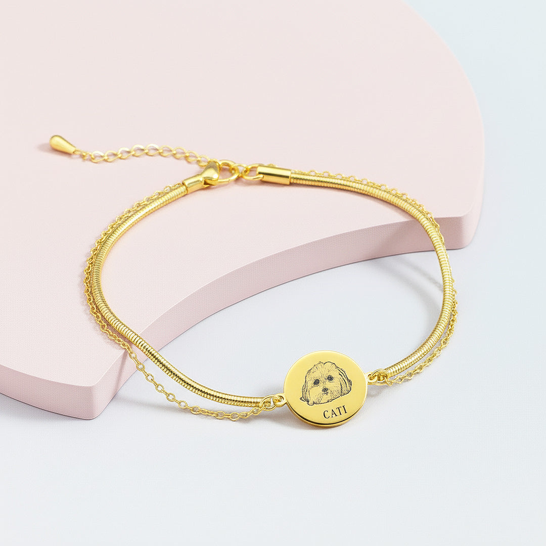 With a round pendant as its centerpiece, you can customise it with up to two names or pet portraits, making it the perfect way to keep loved ones (human or furry!) always by your side. Available in classic gold or silver, this bracelet is both meaningful and stylish—ideal for daily wear or gifting.
