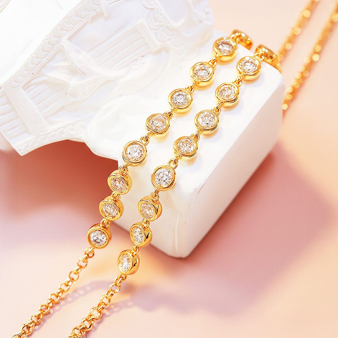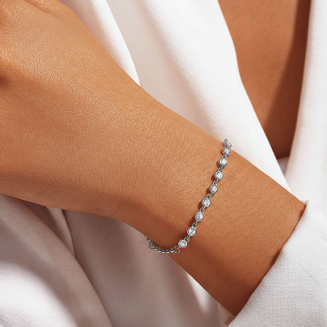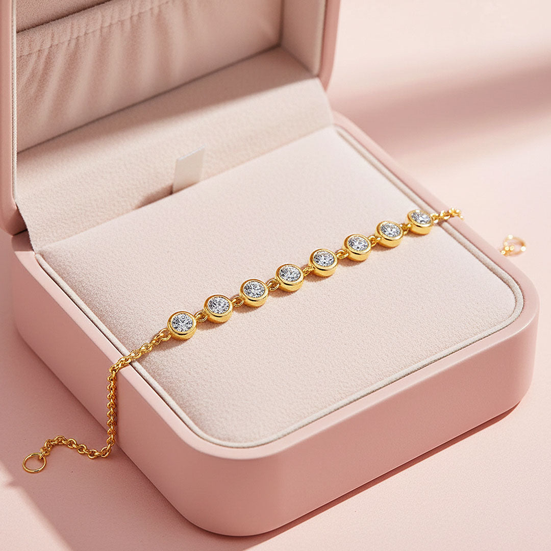 Prm9131 – Luna Bezel is a timeless expression of understated luxury. Featuring nine perfectly proportioned moissanite stones encased in smooth, polished bezel settings, this bracelet delivers a seamless line of brilliance that glows with every movement. The clean, minimalist design enhances the fire and clarity of each stone, creating a look that is elegant yet effortlessly modern.