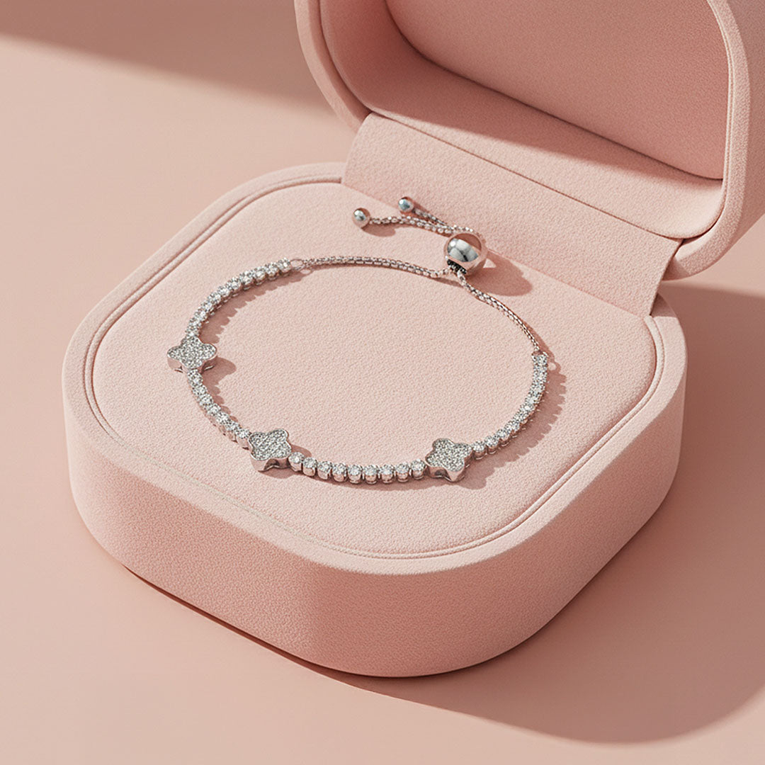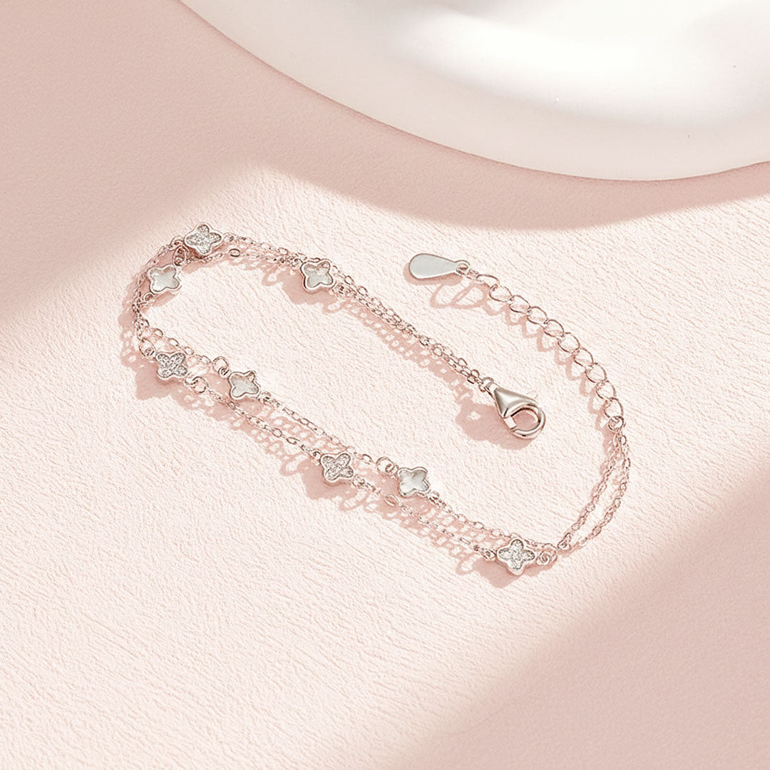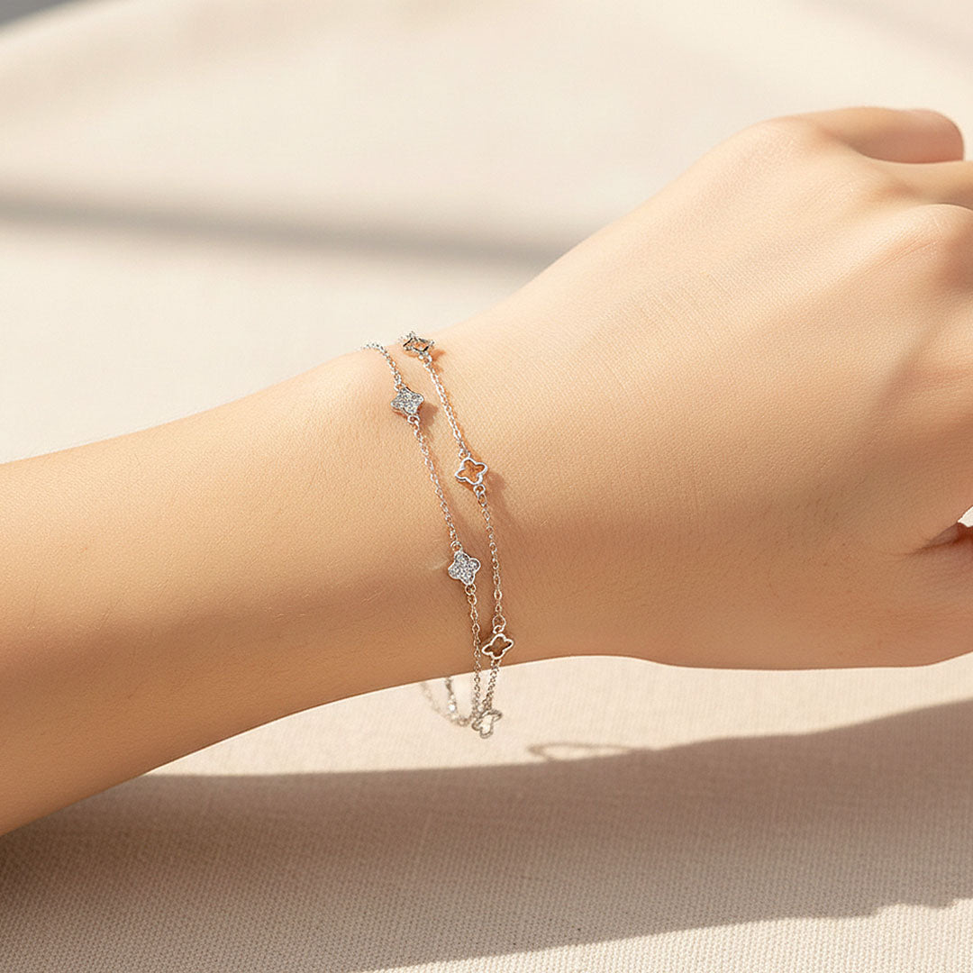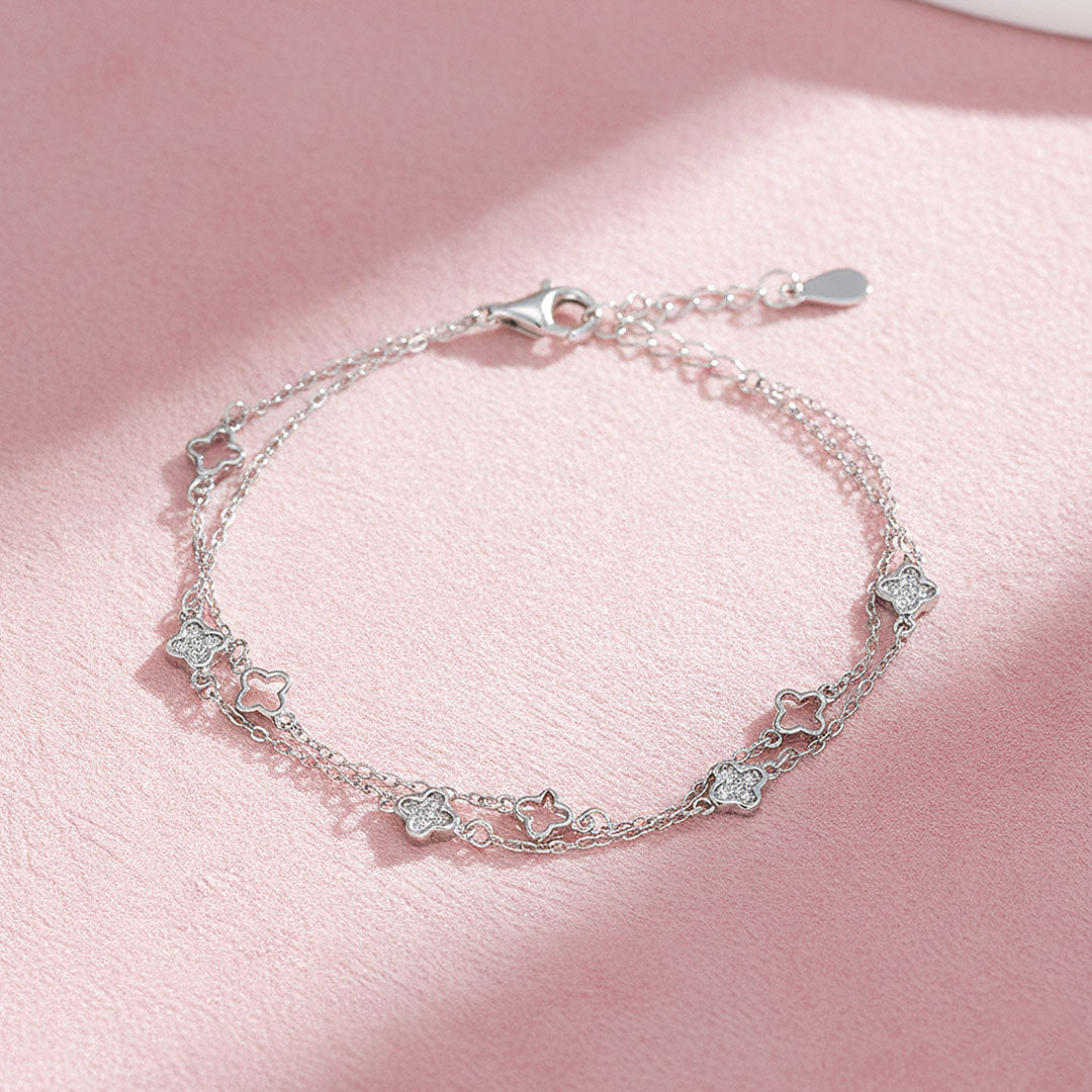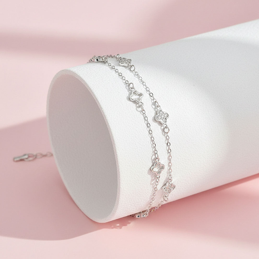 Delicate yet captivating, the Prm9139 – Clover Whisper bracelet is designed to embody effortless elegance. Featuring a refined double-chain silhouette adorned with petite clover motifs, each accented with shimmering AAAAAA zircon, this bracelet exudes a soft, graceful sparkle from every angle. The airy spacing of the charms creates a light, feminine movement on the wrist, making it perfect for layering or wearing on its own. Finished in luminous sterling silver with a silky smooth polish, this piece is a timeless expression of charm, refinement, and understated luxury—ideal for daily wear or as a meaningful gift that feels both modern and enduring.