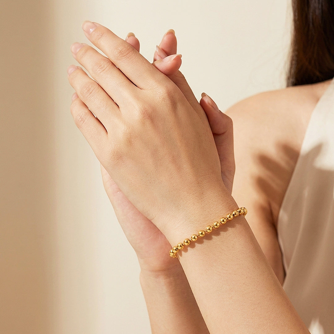 - Ball Beaded Chain Design: Uniformly sized high-polish spherical gold beads run continuously around the wrist — each one individually reflective, collectively luminous.