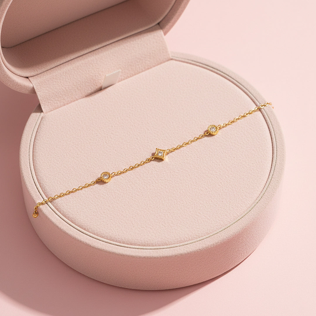 Delicately designed with a fine gold chain, Luxe6525 – Golden Celeste features a graceful arrangement of sparkling cubic zirconia stations, alternating between round halo accents and elegant geometric motifs. Each stone is precisely set to maximise light reflection, creating a radiant shimmer with every movement of your wrist. The refined spacing of the elements gives the bracelet a balanced, airy feel — feminine, modern, and effortlessly luxurious.