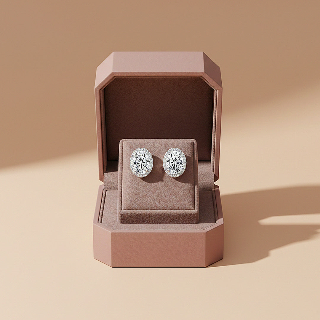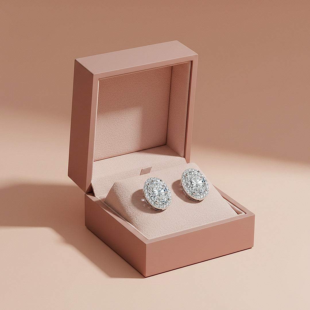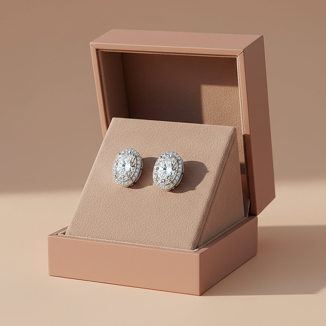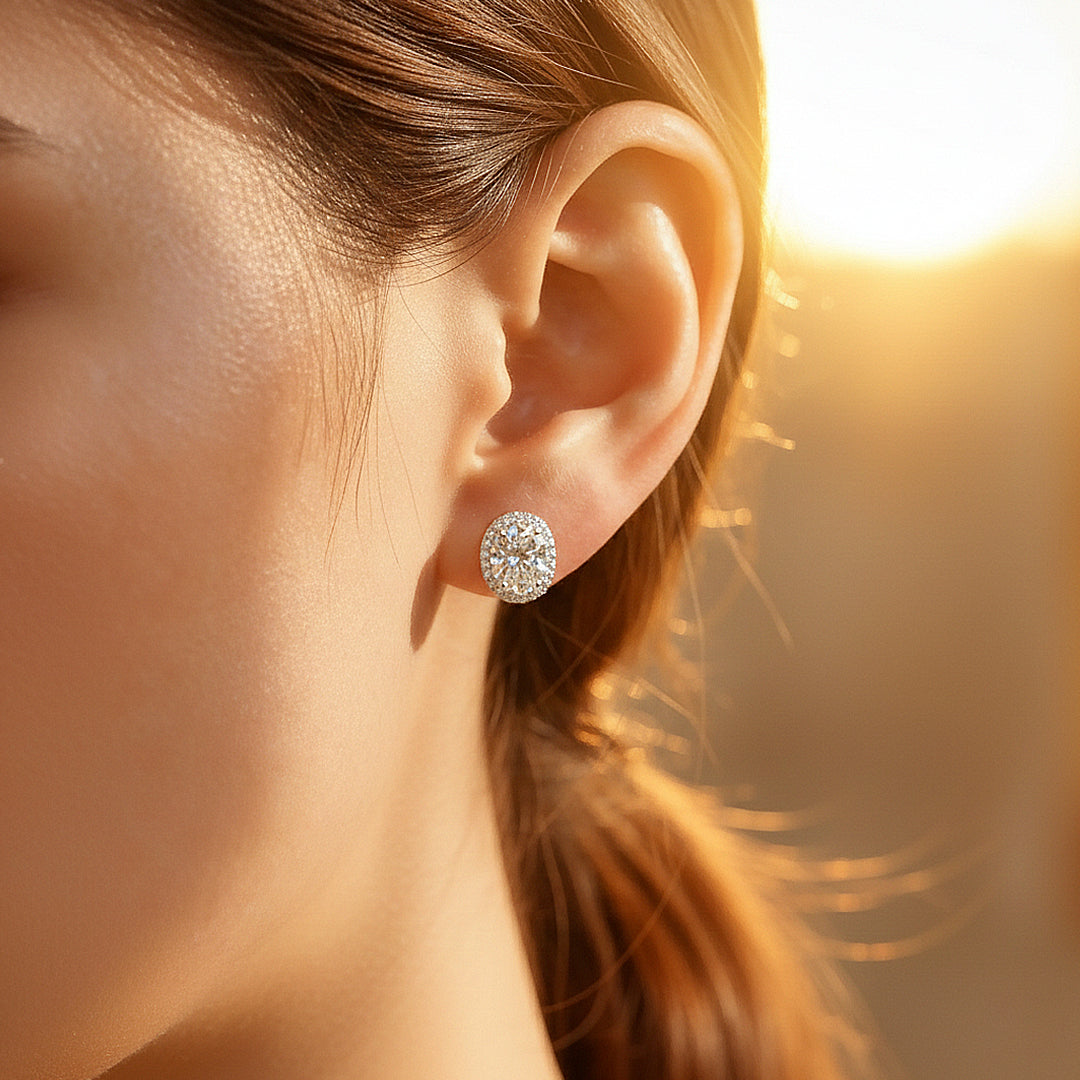 Crafted for those who appreciate uncompromising elegance, Imperial Radiance embodies refined luxury in its purest form. Each earring features a meticulously cut Premium Moissanite at its centre, surrounded by a luminous halo that magnifies its fire and brilliance. The D colour, VVS1 clarity stones capture light from every angle, releasing an extraordinary sparkle that rivals the finest diamonds. Perfectly proportioned at approximately 10.4 × 8.2 mm, the silhouette is bold yet sophisticated — commanding attention while maintaining timeless grace.