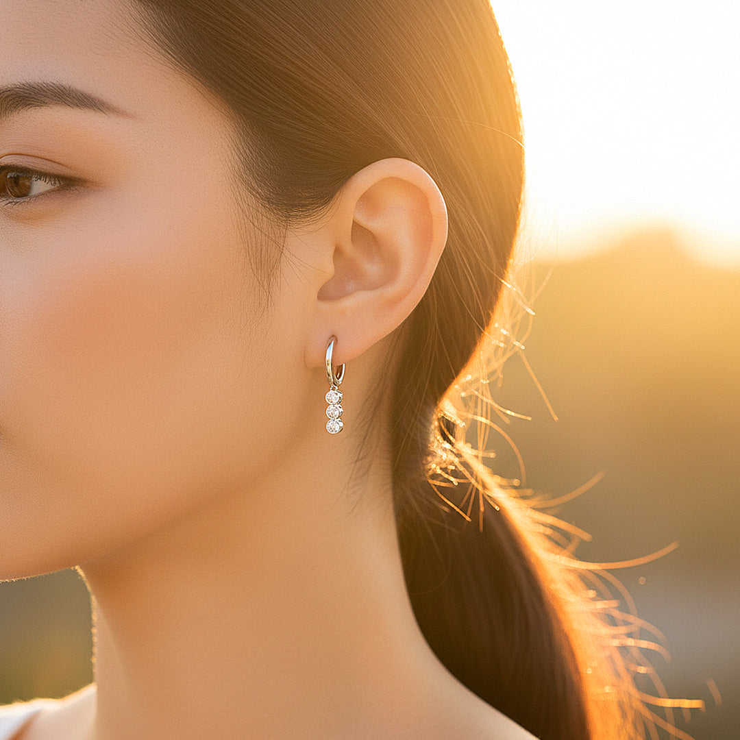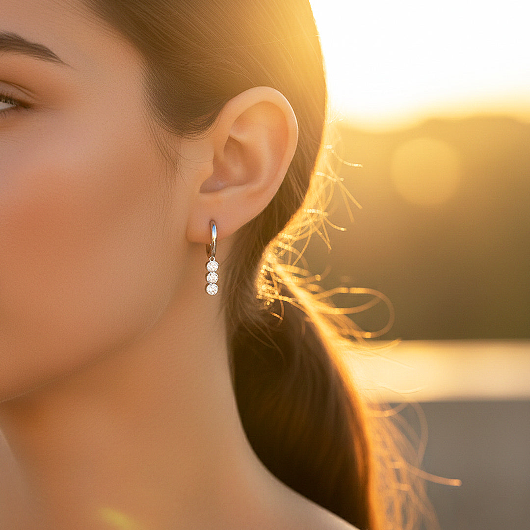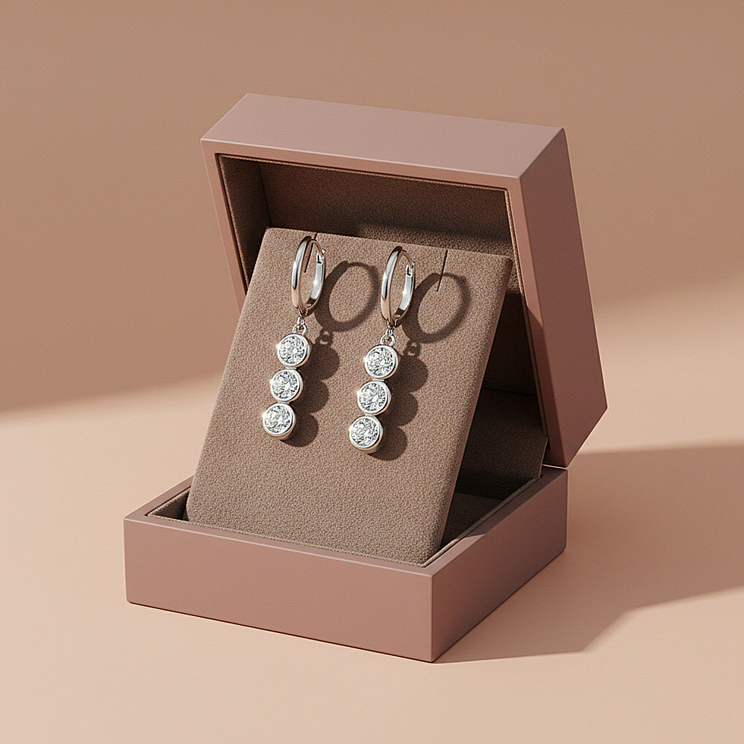 Designed for the woman who appreciates refined elegance with a radiant presence, the Celeste Trio Drop earrings embody timeless sophistication with a modern, luminous edge. Three perfectly proportioned premium moissanite stones cascade gracefully from a polished 925 silver hoop, creating a fluid silhouette that captures and reflects light from every angle. Each D-colour, VVS1 clarity stone radiates extraordinary fire, delivering an unmistakable brilliance that rivals the finest diamonds.