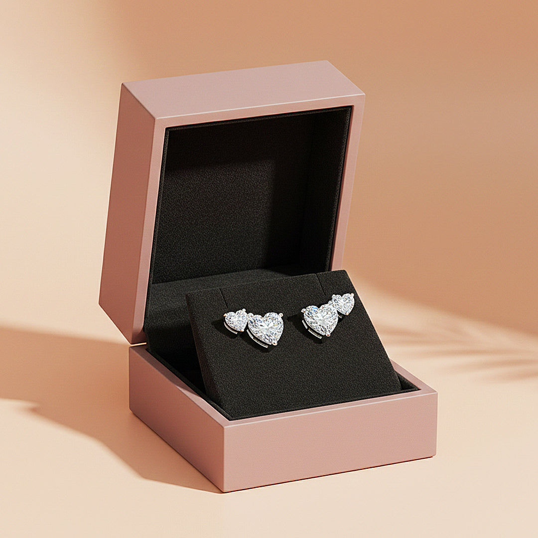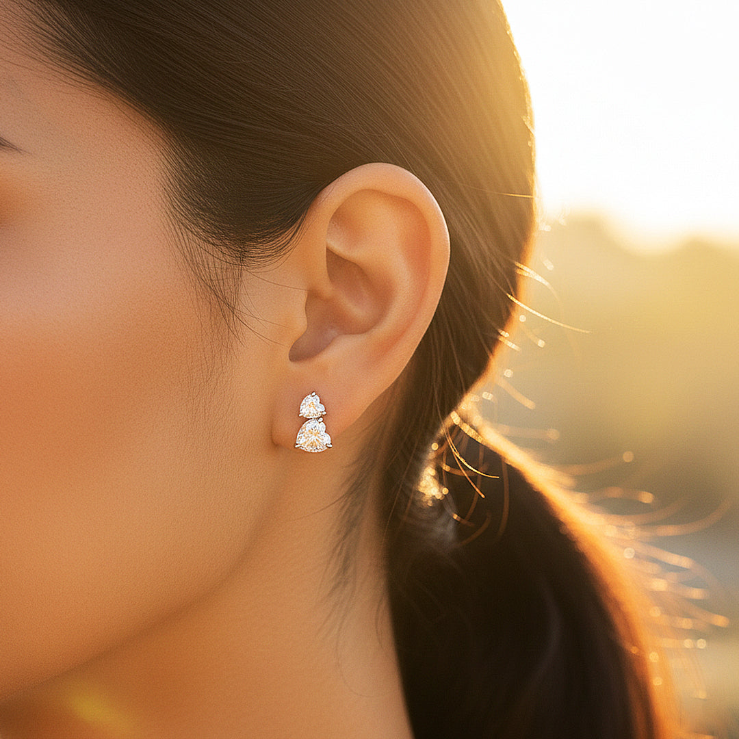 Celestial Hearts is a refined celebration of romance elevated to its most luxurious form. Each earring showcases a perfectly cut 6.5mm heart-shaped Premium D-colour, VVS1 Moissanite, paired with a delicately balanced 5.0mm heart above it. The dual-heart silhouette creates a graceful cascade that catches the light from every angle, producing an extraordinary display of diamond-like fire and scintillation. Every facet is precision-cut to maximise brilliance, resulting in a luminous sparkle that feels both captivating and undeniably prestigious.